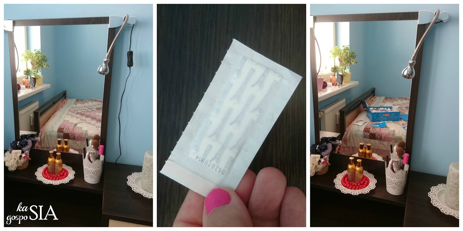 A ja jak wykorzystałam taśmy montażowe tesa? Przyznam szczerze – mało oryginalnie ;). Na pierwszy ogień poszło udoskonalenie mojej toaletki. Widzicie zdjęcie po lewej? Po obu stronach lustra wkurzały mnie te kable zwisające od lampek. Wystarczyła jedna taśma podklejona z tyłu lustra i… otoczenie toaletki wygląda teraz o wiele lepiej :).